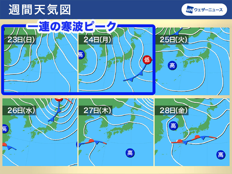 今週は冬型の気圧配置が続き寒波に見舞われていますが、一連の寒波の中での後半のピークがちょうど今週末の三連休と重なる見込みです。