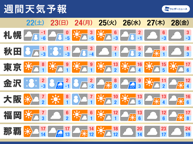 今週末は2月23日(日)天皇誕生日と24日(月)振替休日を含む三連休です。大雪や厳しい寒さとなります。来週は寒波の影響が落ち着き、すこし春めいてきます。