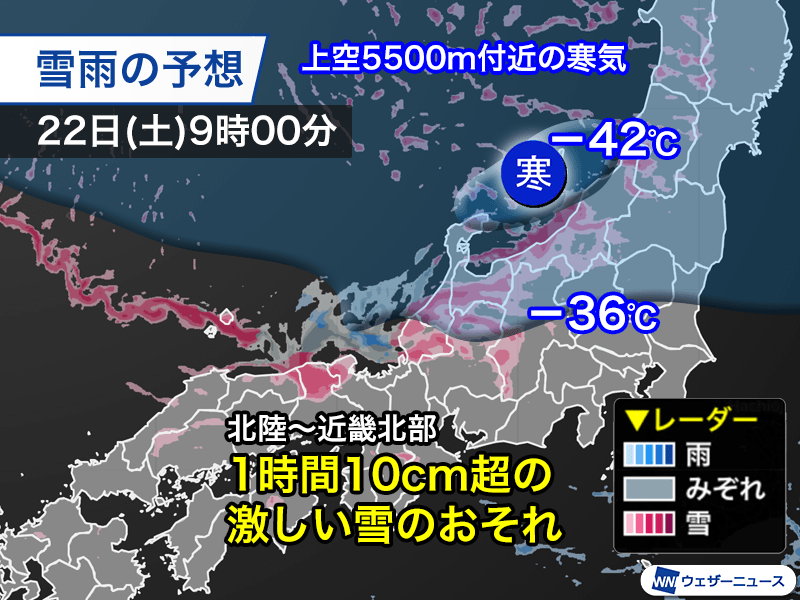 明日22日(土)は今日よりも寒気が南下します。上空5500mで−42℃以下の非常に強い寒気の中心が北陸付近を通過する予想で、周辺では大気の状態が不安定になる見込みです。