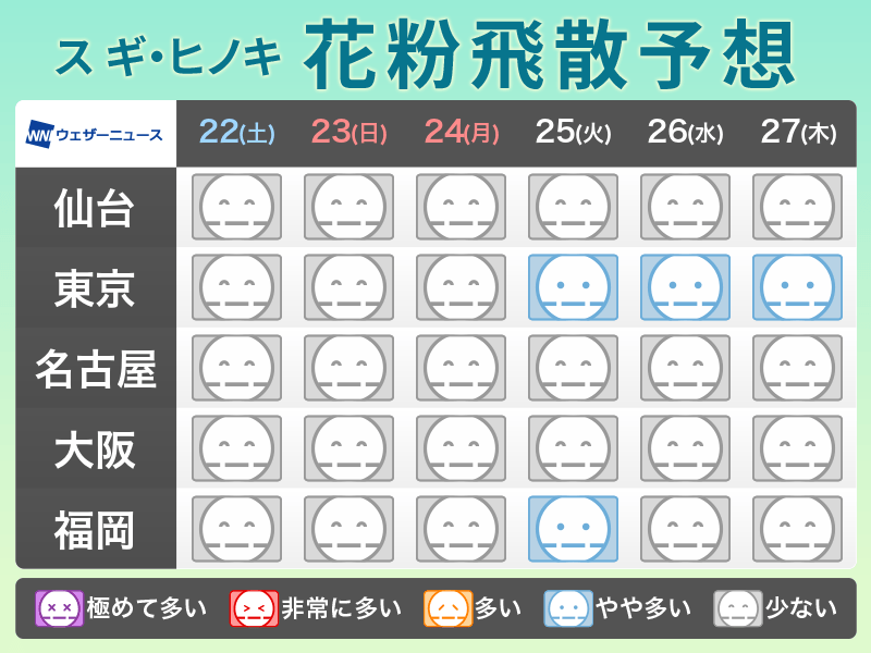 すでにスギ花粉の飛散が始まっている地域を中心に飛散量が増加し、東京は25日(火)から連日、「やや多い」予想で、福岡など九州もやや多く飛ぶ所がある予想です。