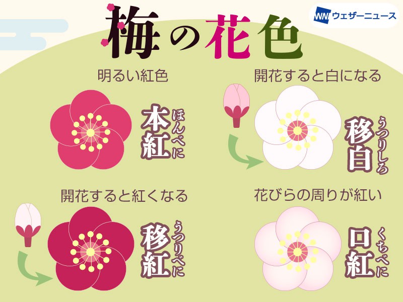 どれも和服を思い起こすような素敵なネーミングですね。梅の花を観賞する時は、花の色にも注目してみるといっそう楽しめるかもしれません。
