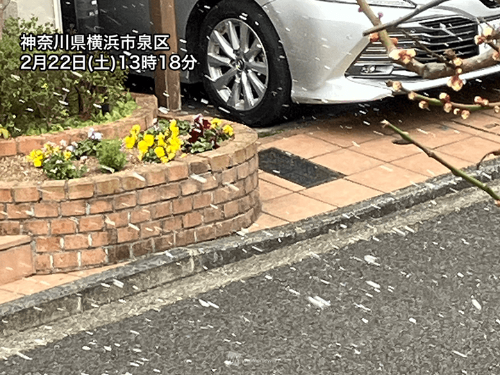 東京・多摩エリアや神奈川県の内陸部でも雪になった所があり、雪粒がしっかりと見えるくらいの降り方です。