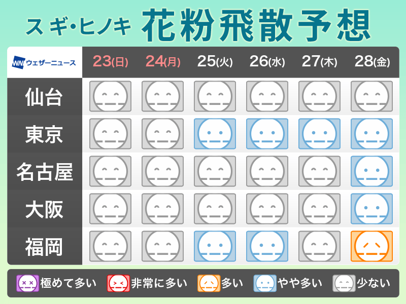 すでにスギ花粉の飛散が始まっている地域を中心に飛散量が増加し、東京は25日(火)から連日、「やや多い」予想です。28日(金)は福岡など九州や中四国では「多い」予想です。