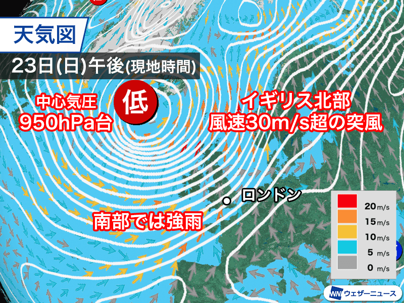 中心気圧が950hPa台まで発達した低気圧が大西洋の北部を北上しています。この低気圧の影響でイギリスは荒れた天気になっていて、スコットランドを中心とする北部では風が強まっている状況です。沿岸部では瞬間的に30m/s以上の暴風の吹いている所があります。