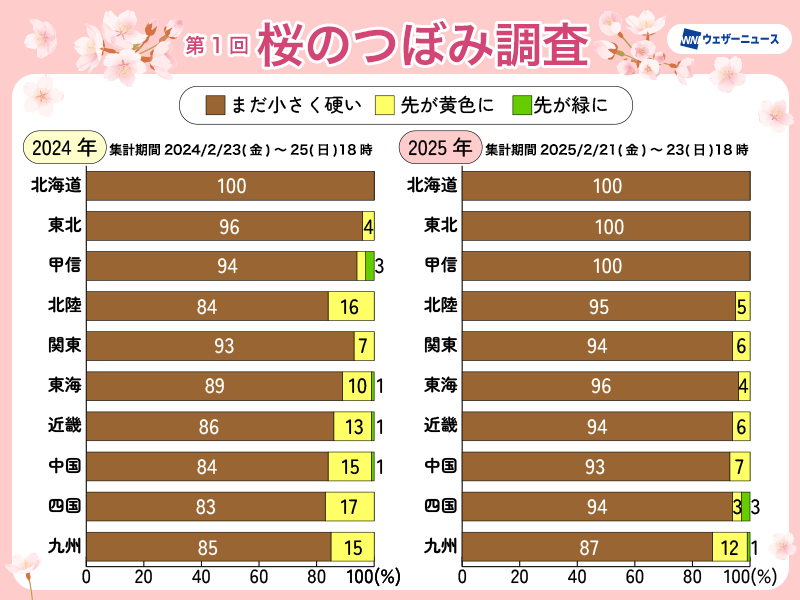 全国的に、9割以上のつぼみが「まだ小さく硬い」状態です。つぼみの生長を昨年と比較すると、西日本や東日本は遅れているようです。