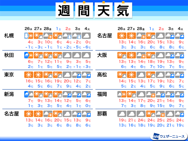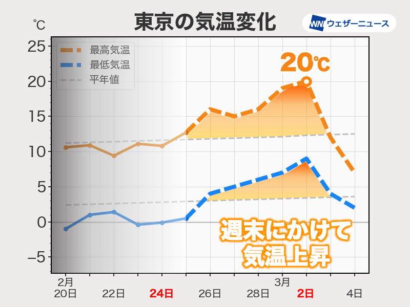 東京都心の気温変化を見ると、これまでは平年よりも気温の低い日が続いていたものの、明日26日(水)から週末にかけては平年より気温の高い日が続く見通しになっています。3月2日(日)の最高気温は20℃と、4月中旬並みの暖かさになる予想です。