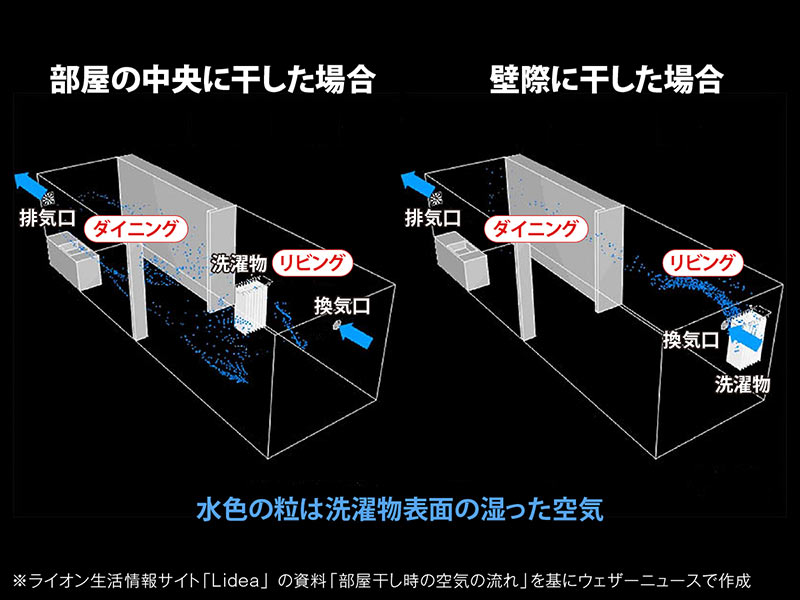 「まず、冷たい空気は床近くの低い位置にたまりやすく、あたたかい空気は高い位置にたまりやすい性質をもっています。そのため、できるだけあたたかい高い位置の方が、乾きやすくなります。