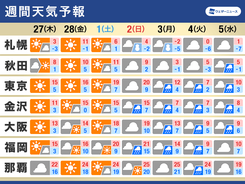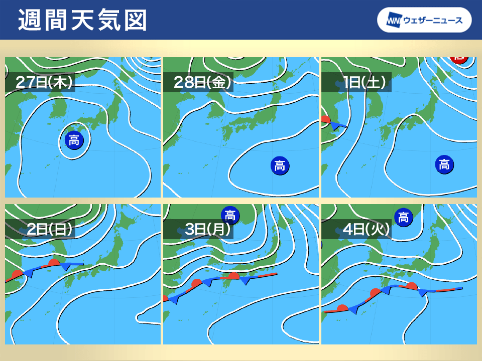 今週後半は土曜日にかけて日本列島の南にある高気圧圏内となり、晴れるところが多くなる見込みです。28日(金)は西日本でやや雲が多く、太平洋側を中心に雨の可能性があります。