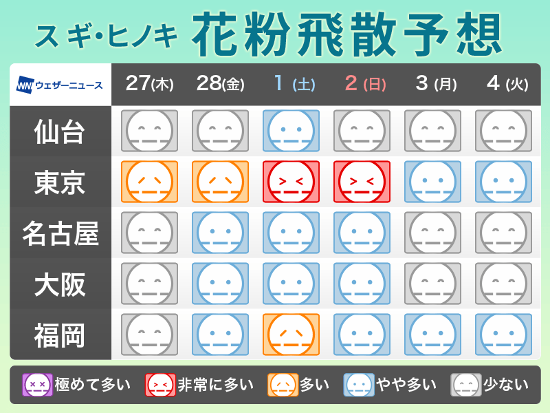 気温上昇とともに西日本や東日本の太平洋側を中心にスギ花粉の飛散が増加する見込みです。東京では週末は「非常に多い」予想となっています。