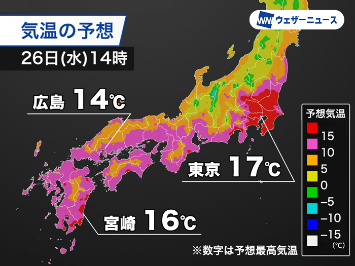 今日26日(水)は関東から西日本は晴れるところが多くなります。南から暖かい空気が流れ込むため、昼間は気温が上昇して関東の各地は15℃以上になる見込みです。