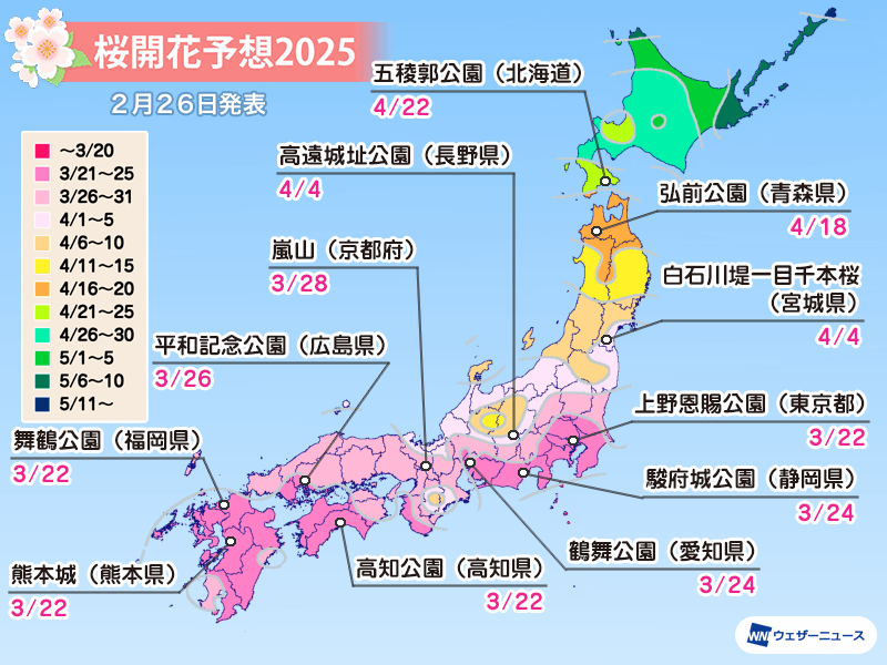 2025年の桜の開花一番乗りは3月21日(金)の東京で、22日(土)に福岡や高知、横浜が続きます。西日本と東日本の多くの地点で平年並となり、関東では平年よりやや早いところがある予想です。強い寒波により桜のつぼみの生長は一部で遅れているものの、開花時期への影響はわずかと見ています。