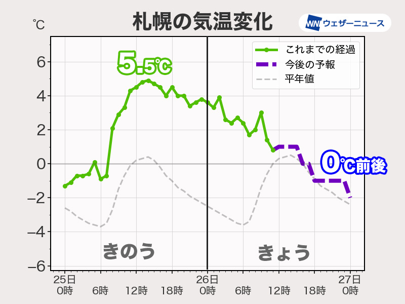 札幌では未明の1時53分に4.8℃を観測した後、気温が右肩下がりで11時の気温は0.7℃となっています。夜はさらに冷え込みが厳しくなるので体感の変化に注意が必要です。