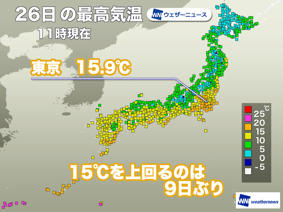 11時時点の最高気温を見ると関東エリアで気温が上がっている様子が分かります。東京では15.9℃を観測して17日(月)以来、9日ぶりに15℃を上回りました。日照の影響に加えて上空に比較的暖かい空気が流れ込んでいる影響だと考えられます。