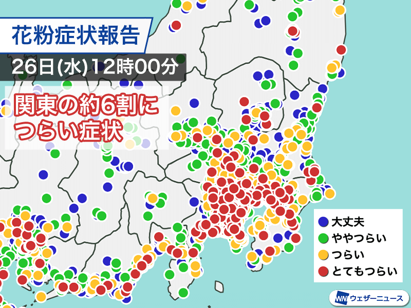 ウェザーニュースアプリ利用者からの花粉症状報告では、12時までの12時間の集計で関東の約1割の方が「とてもつらい」と回答していて、「ややつらい」「つらい」と合わせると6割に達しています。多くの人に症状が出ている状況です。