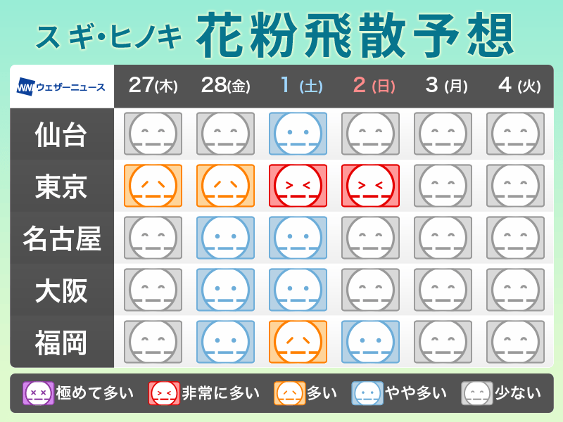 東京では花粉飛散予想が「非常に多い」ランクとなる日がありますので、大量飛散に備えて万全の花粉症対策を行うようにしてください。ただ、3日(月)以降は前線が停滞して雨が降る日が多くなり、飛散は控えめになる予想です。