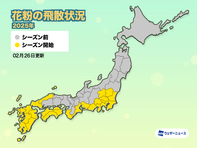 西日本や東日本では花粉の飛散開始エリア、本格シーズンのエリアがさらに拡大し、東北南部でも飛散が開始する可能性があります。