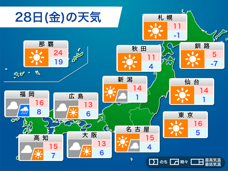明日28日(金)は上空の寒気が北に退いて、北日本でも気温が上昇。春本番を思わせる暖かさになる地点が多くなります。