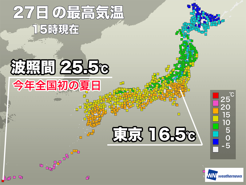 また、沖縄県波照間島のアメダスでは25.5℃を観測して、今年全国初の夏日となっています。