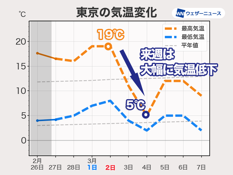 前線や寒気の動向にはまだ不確実性があるものの、短期間に体感が大きく変化する確度が高くなっています。体調を崩さないようにご注意ください。週末の暖かさに誘われても冬物はまだクリーニングに出さない方が安心です。