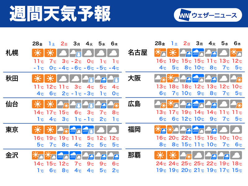 昇温のピークは3月2日(日)の見込みで予想最高気温は福岡で23℃、高知で21℃、東京や大阪で19℃です。東京の19℃は4月中旬並みの気温になります。西日本・東日本ではスギ花粉の飛散が増えており、この暖かさでスギ花粉が大量に飛散するおそれがあります。花粉症の症状がある方は万全な対策が欠かせません。