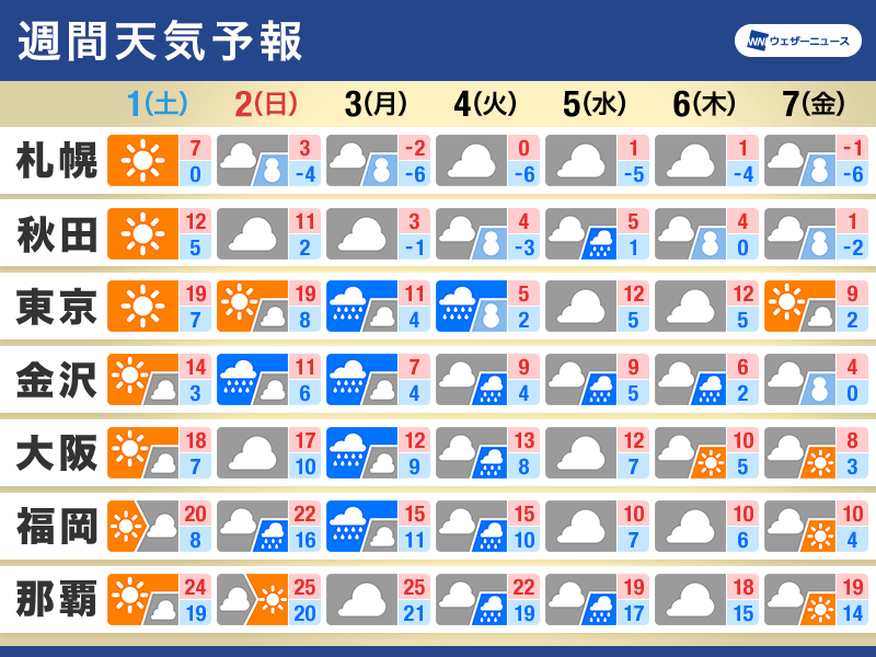 また、寒気の影響で全国的に気温が低下する予想です。週末の春のような暖かさから一転し、関東や北日本では真冬並みの寒さとなります。短期間で大きく体感温度が変わるので、服装選びや体調管理には十分ご注意ください。