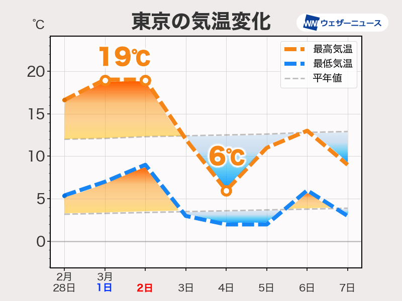 東京都心は1日(土)、2日(日)ともに19℃と、4月中旬並みの気温になる予想です。この暖かさで西日本・東日本ではスギ花粉の飛散量が増えていて、この週末は大量に飛散するおそれがあります。花粉症の症状がある方は万全な対策が欠かせません。