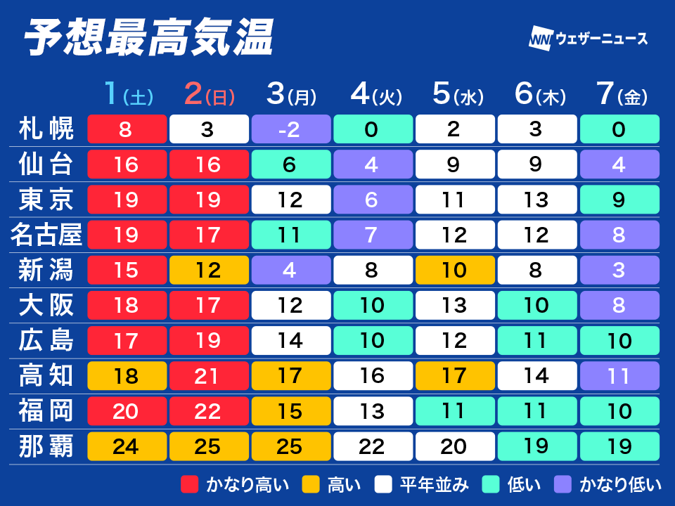 予想最高気温は関東から西日本の各地で20℃前後で、福岡市では2日(日)は4月下旬並みの22℃まで上がるとみています。宮崎市ではさらに高く、25℃以上の夏日になる可能性があります。