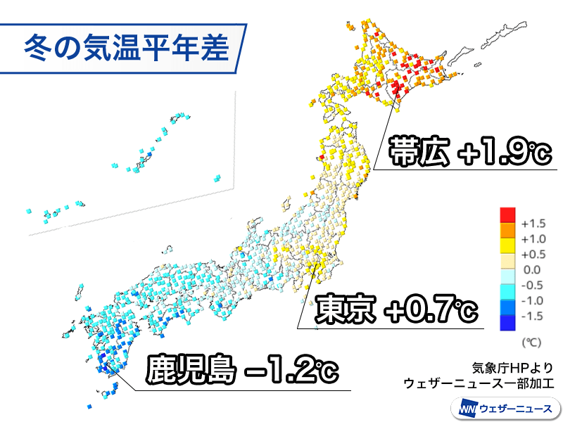 また、冬の期間(12〜2月)では−0.07℃でほぼ平年並みになりました。