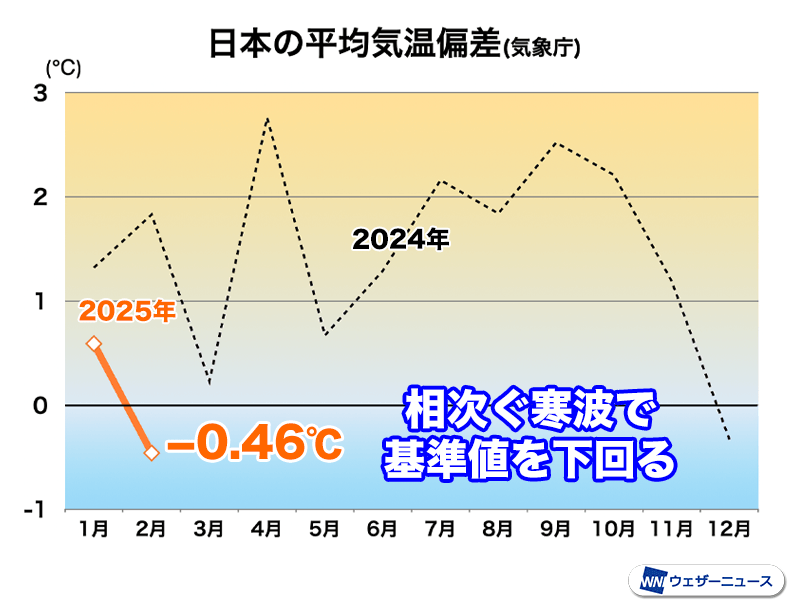 2月の気温は相次ぐ寒波で基準値下回る 冬の期間はほぼ平年並みも地域差大
