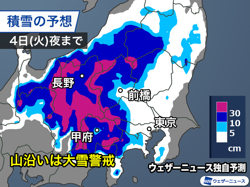 関東西部や北部、甲信の山沿いは3日(月)から断続的に雪が降り、4日(火)の低気圧接近時は雪が強まる予想です。