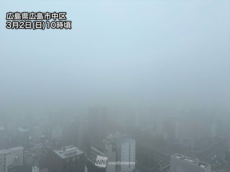 黄海から朝鮮半島付近に延びる前線の一部が本州にかかり、西日本を中心に雨を降らせています。この前線の影響で霧が発生していると考えられます。今夜から明日3日(月)にかけて前線は南下傾向ですが、動きが鈍いため霧が解消するまでに時間を要する可能性があります。