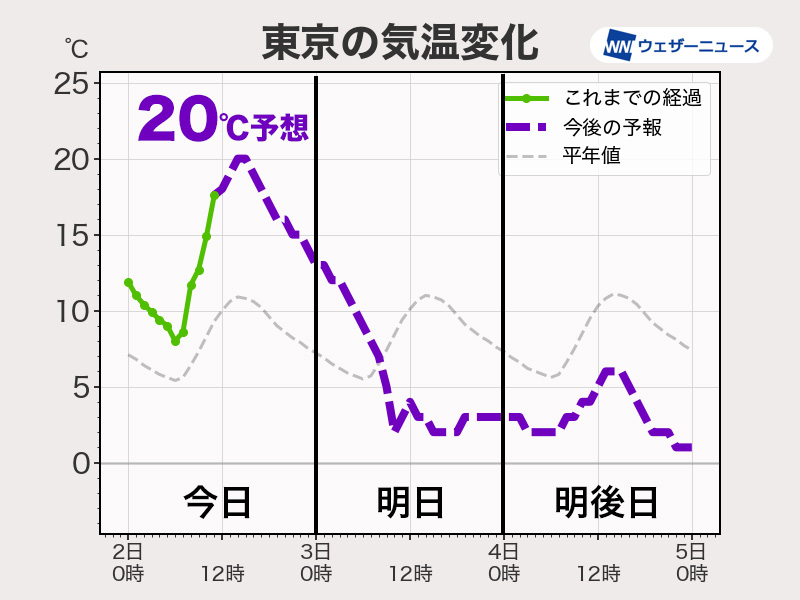 今日2日(日)は上空の暖気に覆われて、広い範囲で春本番を思わせる暖かさになっています。東京の予想最高気温は4月中旬並みの20℃で、20℃に到達すれば今年初めてです。