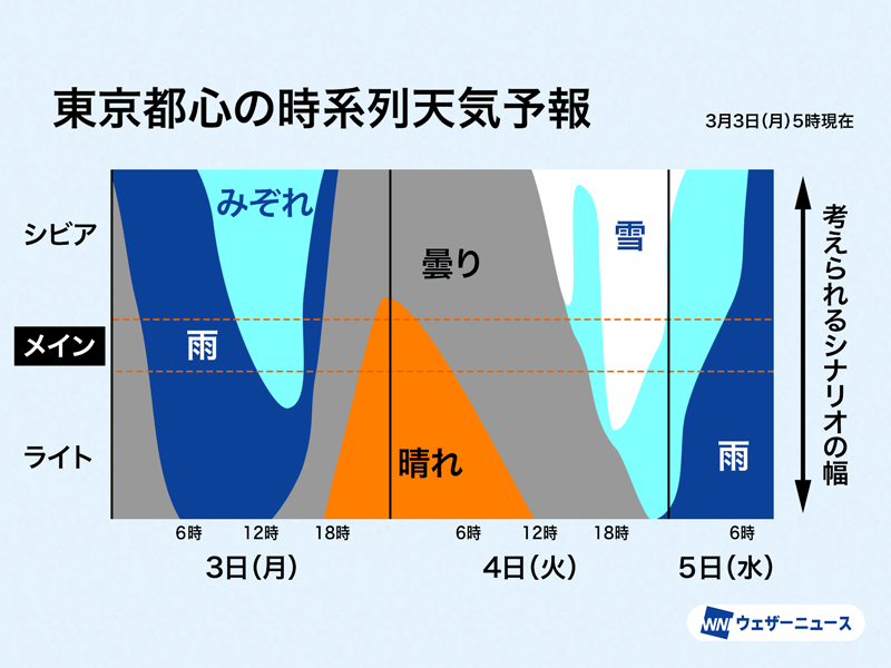明日4日(火)は南下した前線上に低気圧が発生して、前線が再び北上する見込みです。低気圧が東に進み、上空の寒気が残った状態で関東の南岸に接近するため、関東では夜になると湿った雪が降り出します。東京都心では雪が5日(水)の未明まで続くとみられ、23区内でも芝生にうっすらと積もる可能性があるとみています。多摩エリアや23区西部では道路にも雪が積もることも考えられるので、車の運転は冬タイヤを装着するようにしてください。