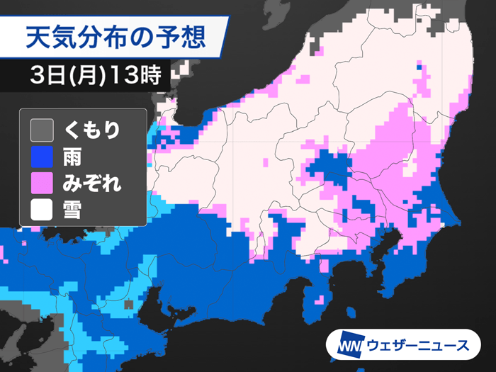 寒気の影響で東京都心を含む関東南部でも、雨が一時的に霙(みぞれ)や湿った雪に変わる可能性があります。ただ、前線の南下に伴って夜には雨や雪は止む見通しで、道路にまで積もる可能性は小さいとみています。
