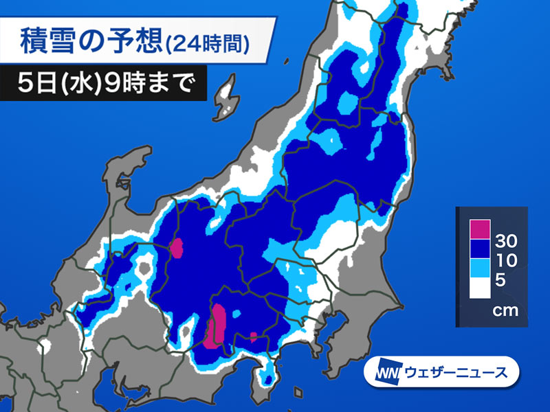 関東西部や北部、甲信の山沿いでは4日(火)午後から湿った雪が断続的に降る予想です。5日(水)朝までの積雪は山沿いの多い所で30cm以上、平野部や盆地でも10〜30cmに達する可能性があります。車での走行には冬用タイヤの装着が欠かせません。
