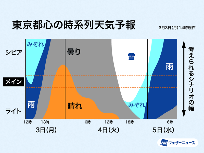 東京都内では雪が明日4日(火)夕方から明後日5日(水)の未明まで続き、23区東部では積雪なしか芝生にうっすらと積もる可能性があると見ています。一方、多摩エリアや23区西部では路面にも雪が積もる可能性があるので、車の運転には冬タイヤを装着するようにしてください。