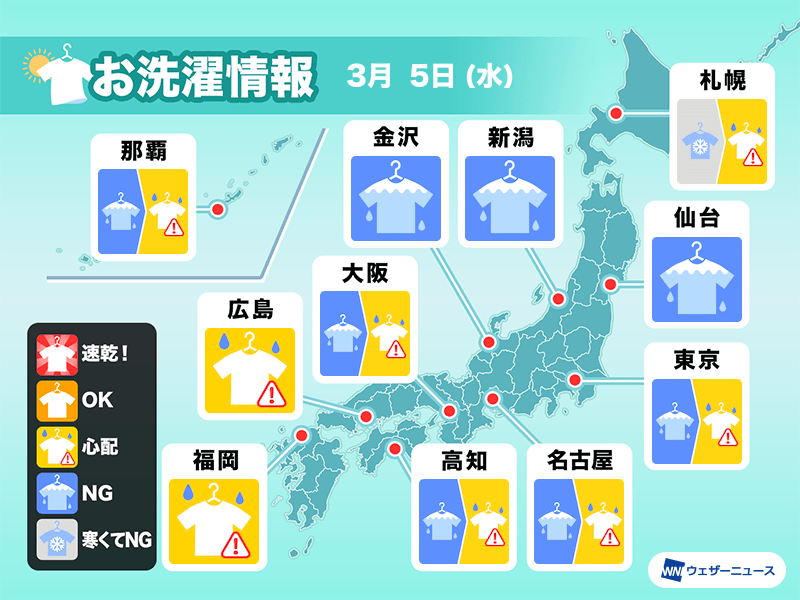 今日は全国的に冷たい雨や雪が降りやすく、外干しをするのは難しい天気です。乾燥機やコインランドリーなどをうまく活用してください。