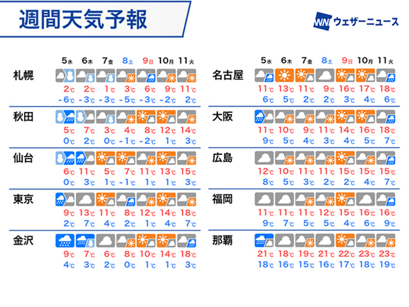 来週になると寒気の影響が解消し、各地で春の訪れが加速しそうです。11日(火)は東京や名古屋、大阪で最高気温が18℃の予想です。北海道の札幌でも10℃を超えるようになります。