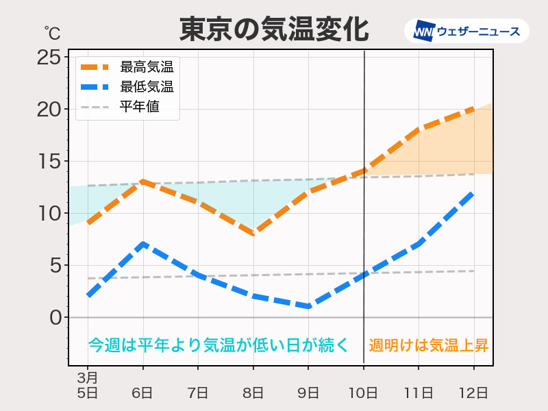 週後半にかけても寒気の影響を受け、それほど気温は上がりません。関東から西でも最高気温10℃前後の日が続き、昼間も風が冷たく感じられそうです。