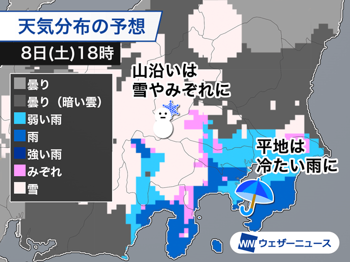 気温が低くなる長野県や、山梨県・関東西部の山沿いでは、雪になるところもある見込みです。まだ雪になる範囲やどのくらい強まるかは予報に幅がある状況です。それほど雪の量は多くならないとみていますが、最新の情報を確認するようにしてください。車でそちらの地域への移動を予定されている方はスタッドレスタイヤやチェーンなどの冬装備が必要となりそうです。