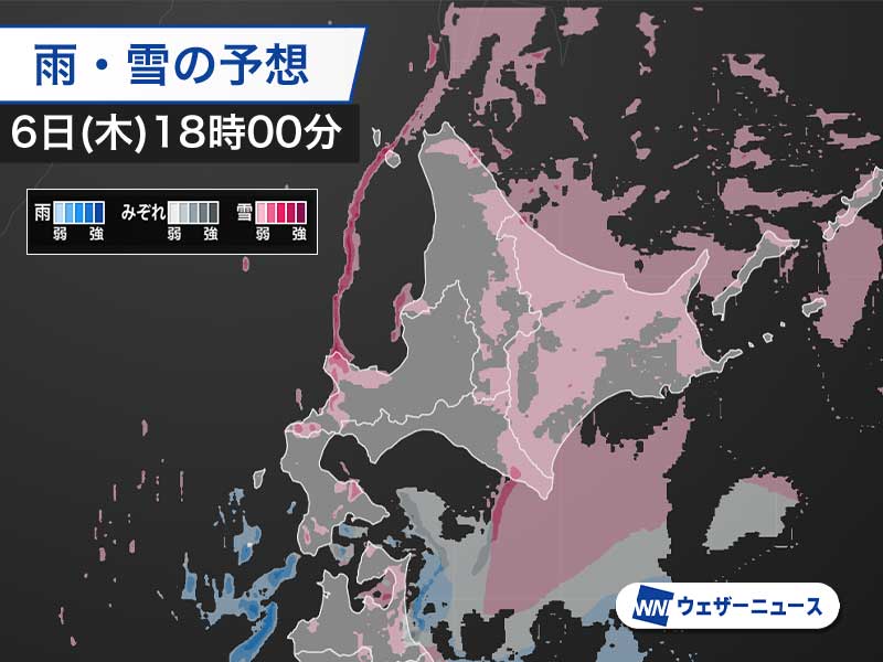 北海道では日本海側を中心に雪が降り、発達した雪雲のラインがかかるようなところでは短時間に積雪が急増するおそれがあります。吹雪による視界不良にも注意してください。