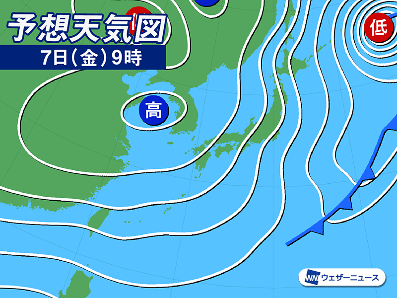 明日7日(金)の日本付近は冬型の気圧配置で、北日本日本海側や北陸では雪が降る寒空となります。北海道では一時的にドカドカと強まる雪に注意が必要です。