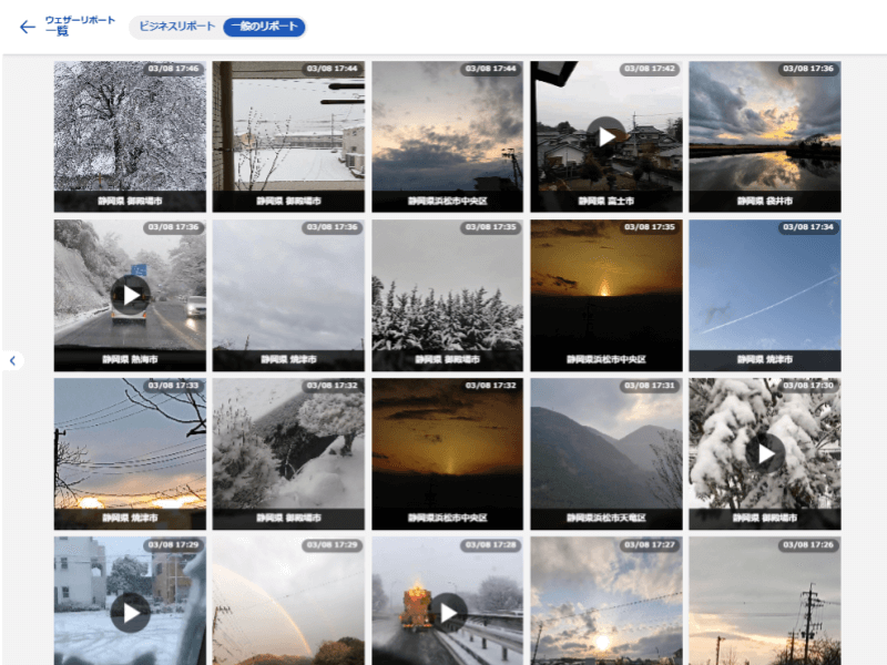 ウェザーニュース for businessの「写真&動画リポート」では、アプリユーザーの皆さまからの天気や季節に関する写真・動画のリポートをご覧いただけます。マップ表示と一覧表示が可能で、キーワード検索や日付・時間帯の指定、エリアでの絞り込みも可能ですので、リアルタイムの情報収集にはもちろん、過去の振り返りなどにも是非ご活用ください。
