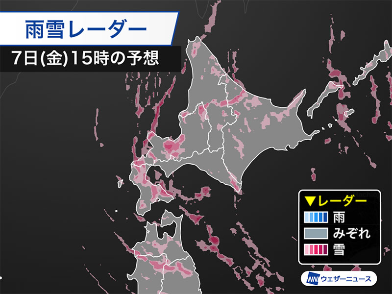 一方、北海道では日本海側やオホーツク海側を中心に雪が降ります。朝から断続的に雪の降っている札幌市周辺では、この後も活発な雪雲がかかりやすく積雪急増が必要です。