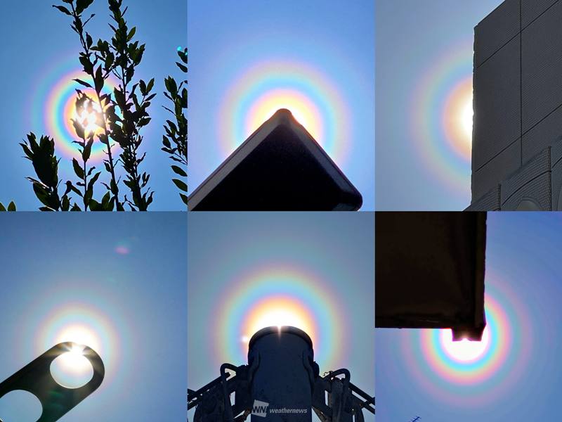 太陽の周囲を囲むように幾重にも虹色の環が見られるのが特徴で、花粉の飛散量が多いほどはっきりと見られます。