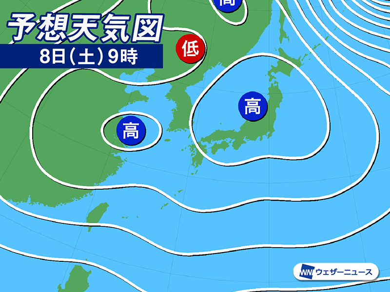 8日(土)は関東の南海上に低気圧が発生する見込みです。関東は夜に雨や雪が降り、山沿いでは雪の積もる可能性があります。西日本や北日本は日差しが届いて穏やかですが、一部で雨や雪の降る心配があります。全国的に気温は低めで、昼間も防寒必須です。