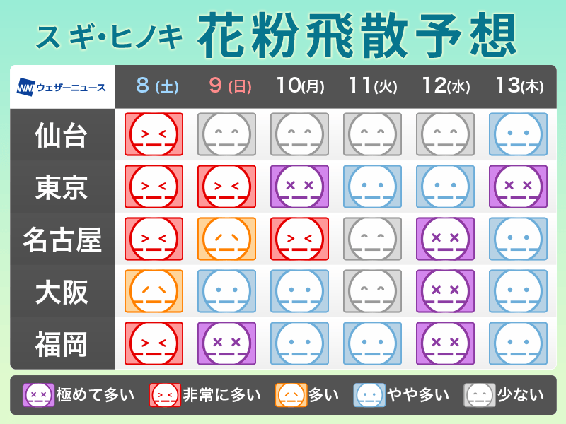 8日(土)まで気温があまり上がらず寒いものの、花粉の飛散が本格化してる西日本や東日本では風が強まると花粉が飛びやすくなります。東京や福岡は、非常に多い予想です。