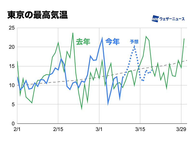 ただ、やはり気になるのは開花目前の時期となる3月の気温です。今週後半にかけては予想気温が平年よりやや高い傾向が予想されていますので、一気につぼみの生長が促されることが期待出来ます。一方で、3月上旬の気温の低さや、今週末以降に下がると予想されている寒さが気になります。昨年のように3月が寒いと“法則”よりも開花が遅れることも考えられるため目が離せません。
