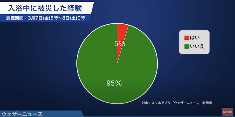 ウェザーニュースアプリでのアンケートによると5%の方は入浴中に大地震にあったことがあるとのことです。