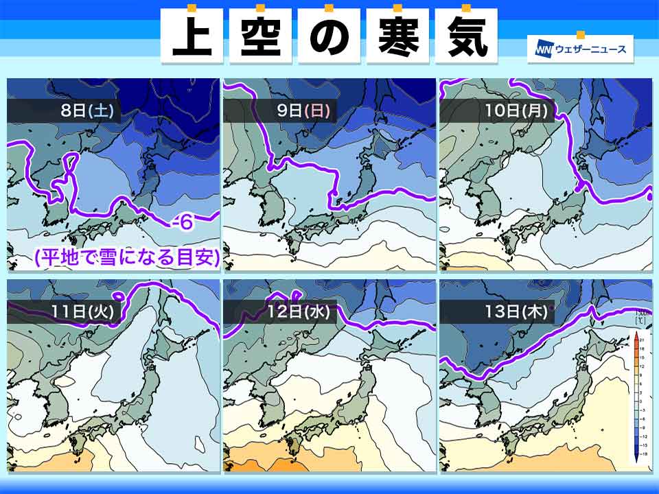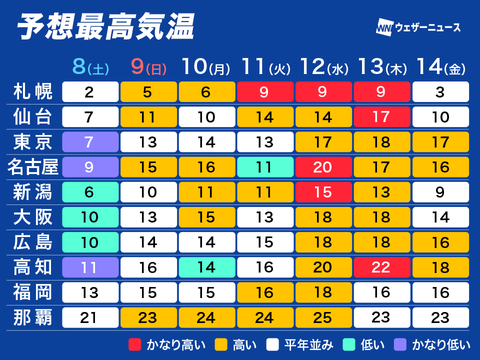 今週末の気温は上空の寒気の影響で平年並みか平年を下回る地点が多く、まだまだ冬の装いが必要になります。